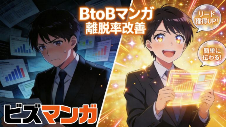 【BtoBマンガ】無形商材のLP離脱率を改善しリード獲得を増やす方法LPの離脱率にお悩みのBtoB担当者必見。複雑な商材の価値を直感的に伝える「BtoBマンガ」の費用対効果や、稟議を通すロジックを徹底解説します。丸投げOKでリード獲得に直結するBtoB特化型ソリューション『ビズマンガ』の導入メリットも紹介。 2026年3月2日