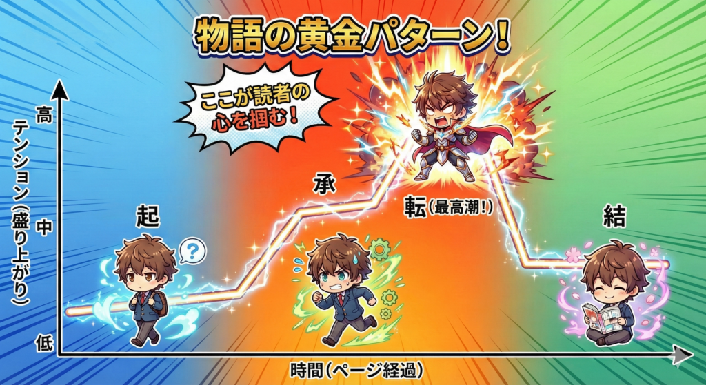 物語の核心である「転」に最も多くのボリュームを割くことで、読者は高い満足感を得られます。多くのヒット作も、こうした読者を飽きさせない構造を非常に大切にしています。