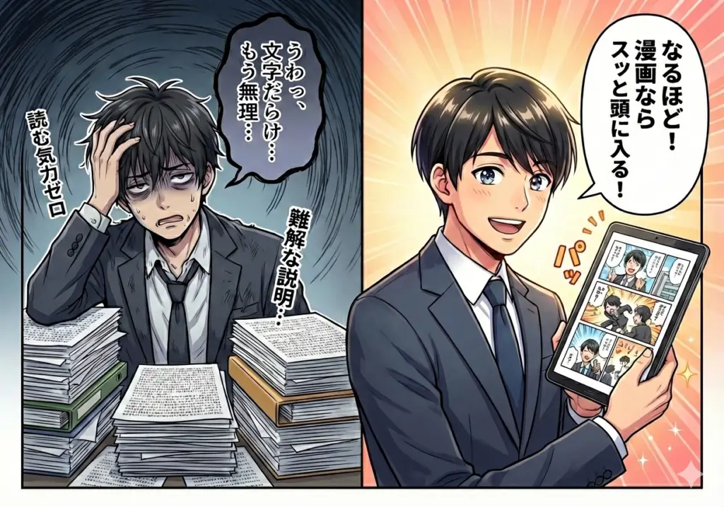 漫画は単なる「広告」ではなく、一つの「読み物」として楽しまれるため、読者の心理的なハードルを下げ、最後まで読んでもらえる確率(読了率)が非常に高いのが特徴です。