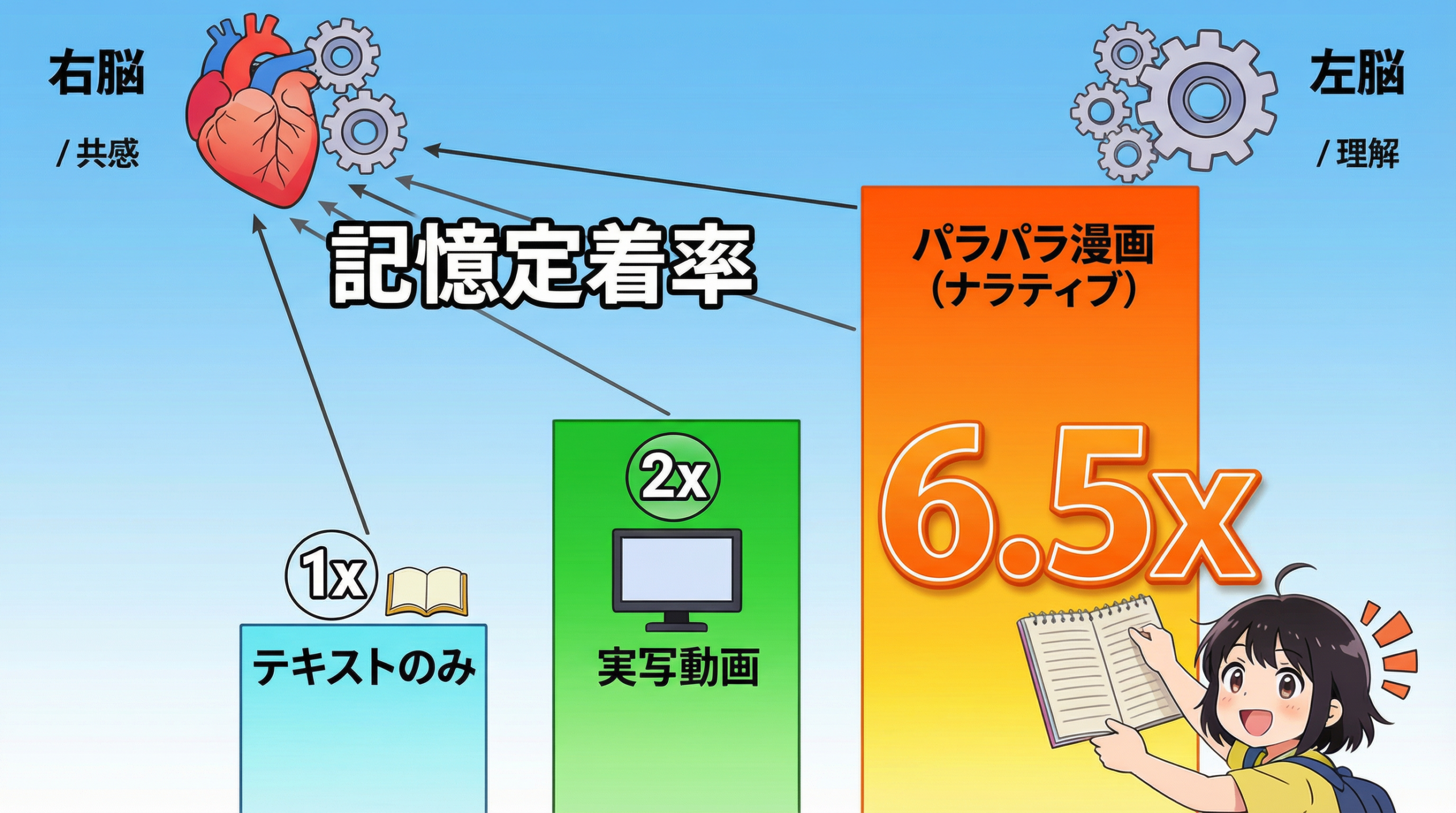 - 二重符号化理論: 言語情報と視覚情報を同時に処理することで、文字のみの場合と比較し、記憶定着率は最大約6.5倍まで向上します。