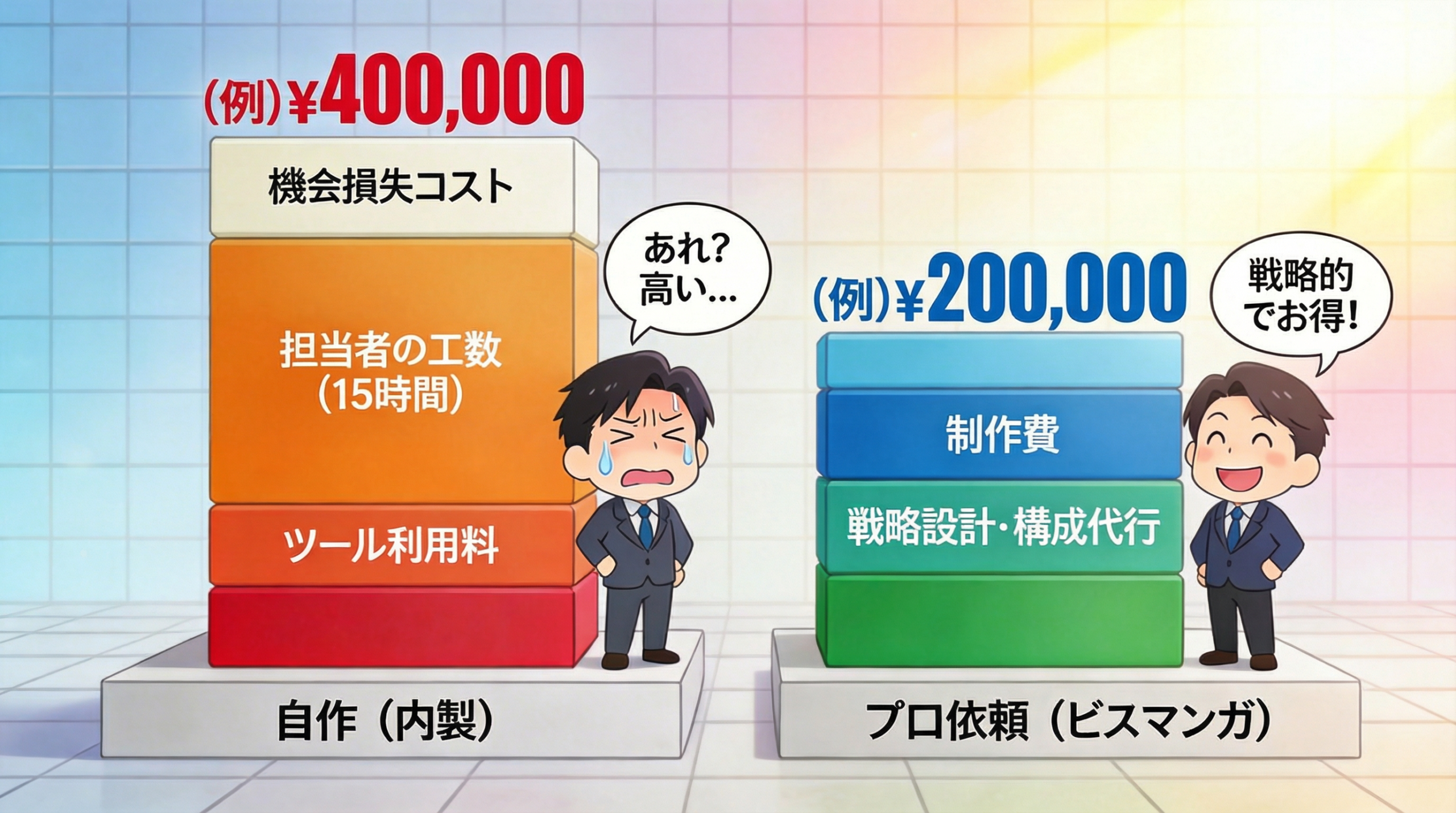 年収600万円の担当者が、構成に悩み、不慣れな操作で15時間(約2日分)を費やすだけで、外注費との差額は容易に逆転します。さらに、その2日間で本来行えたはずの営業活動による利益(機会損失)を加えれば、内製は決して「安くない」選択肢となります。