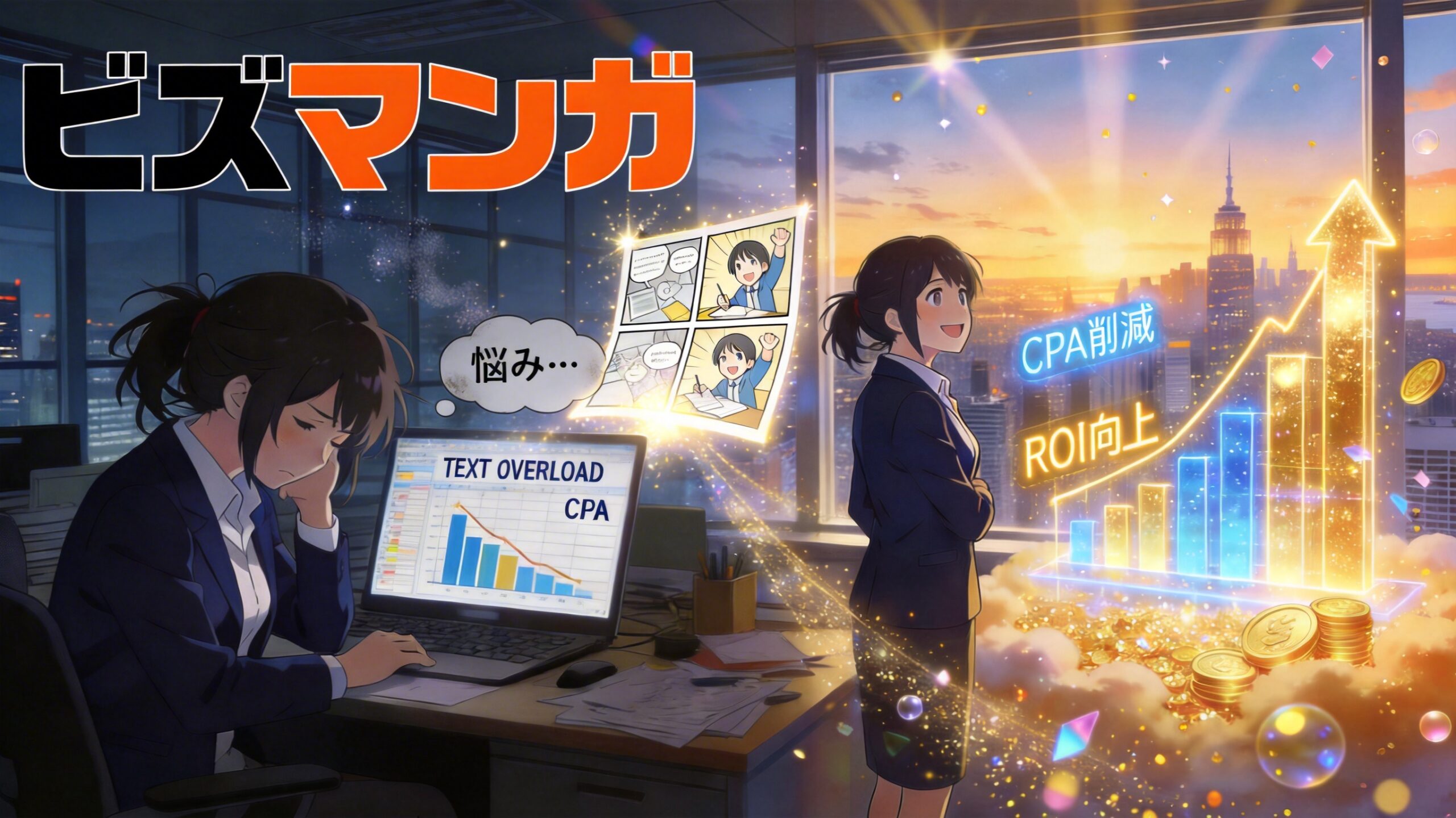 BtoBのCPA高騰やLP直帰率に悩むマーケター必見!複雑なSaaS商材のリード獲得を改善する「四コマ漫画」の活用法を徹底解説。稟議の通し方から、BtoB特化の制作サービス『ビズマンガ』のメリットまで、実務に直結するノウハウをお届けします。